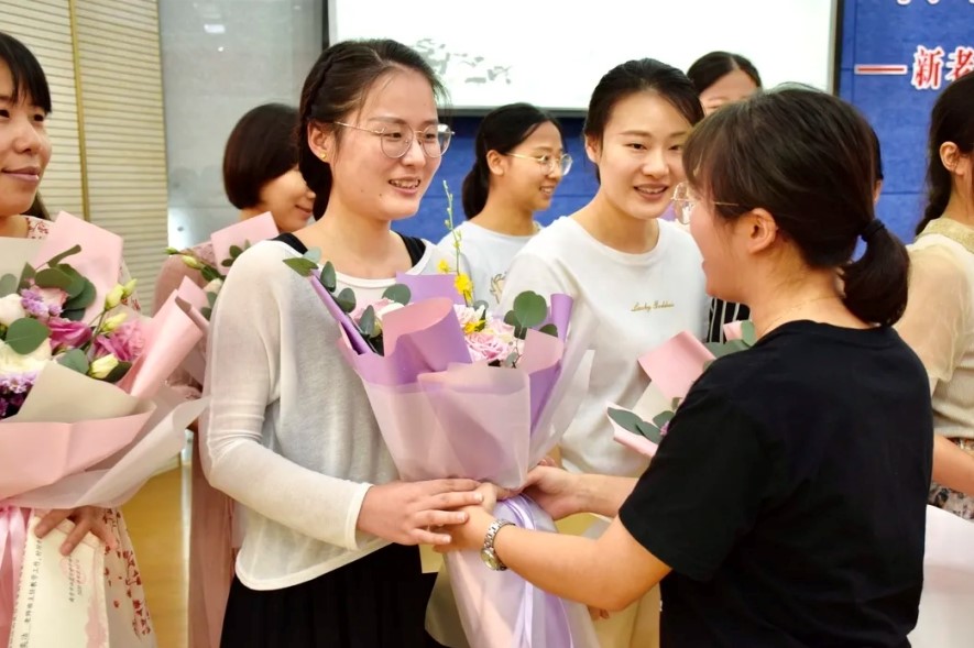 孙进校长、沈丽副校长,曹晓旻主席向各位师傅颁发聘书,徒弟们也上台给师傅献花,他们在庄严而不失温馨的气氛中明确了双方的义务和职责,从此师徒同进,迈向人生目标,共创学校美好未来。