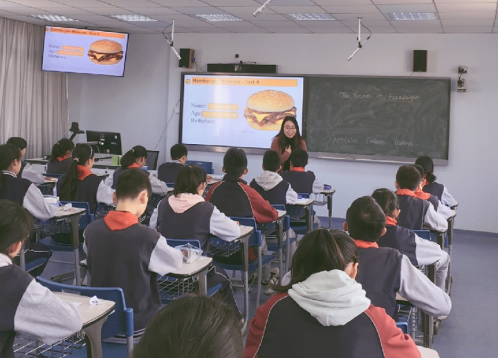 本次活动中,来自雨花台中学春江分校的李静老师带来了一节“The secrets of Hamburger”的群文阅读课,李老师通过说明文,食物金字塔的图片和记叙文的续写三个文本,从汉堡的历史,到食物健康和如何科学的饮食三个方面层层递进,让学生最终形成健康的生活方式。最后让学生自己设计一款健康的汉堡,达到学以致用的目的。