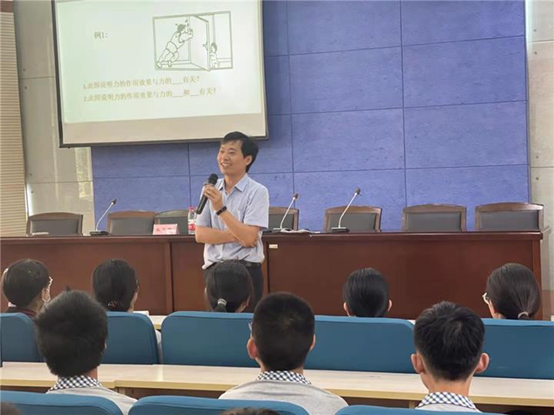 朱教授从一道“推门”力学题目进行引入,同学们积极思考踊跃发言。学生一边在积极回答问题,朱教授一边在持续启发式追问,场面十分热烈。在和同学们交流的过程中,朱教授总结了中考物理五点策略,同时给同学们答题提出了六点备考建议。