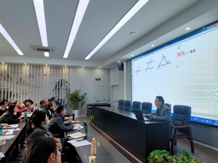 本次教研活动首先由雨花台中学初中部七年级数学组陶蓉老师进行《相交线与平行线》的复习课。陶老师为了加深学生对基本图形的认识,强化了由角的数量关系到线的位置关系的转化。在例题的讲解中,引导学生用多种方法进行思考,丰富了学生的思维活动。陶老师通过本节课提高了学生学习几何的兴趣,在抽象基本图形的过程中提升了学生的能力。