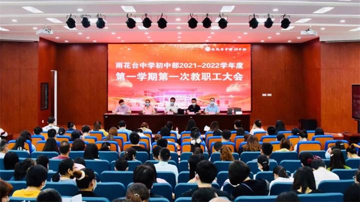 岁月凝眸,淡云辞夏,又是一年浓墨书香。时光辗转,新凉迎秋,又是一片果实累累。伴着初秋的清凉,疫情的退散,全体雨初人迎来了新学期,迈向了雨初中发展的新征程。9月7日上午,雨花台中学初中部2021-2022学年度第一学期第一次教职工大会在我校崭新的报告厅召开,本次会议对暑期工作进行了总结回顾,并全面部署了新学期各项工作。雨花台中学初中部党总支书记、校长孙进,党总支副书记、副校长沈丽,副校长冯志强,副校长张睿,工会主席曹晓旻同志出席会议,会议由沈丽副书记主持,全体教职工参加了本次会议。