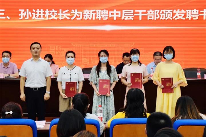 教师是学校教育教学工作的中坚力量,一直以来,雨初中格外重视教师队伍建设。在崭新的发展阶段,雨初中本学期迎来了16位新进教师。会议伊始,沈丽副书记向全体教职工介绍了每一位新进教师。新老师的加入,一定会为雨初中今后的发展注入更新鲜充足的动力。会上,孙进校长、冯志强副校长、张睿副校长通报了新学期校级领导分工及各项聘任决定。孙进校长为新聘任的雨初中人事办公室尹蓉副主任、课程教学处孙苹副主任、教师发展处刁蓉副主任以及团委何后琴副书记颁发聘书。新的岗位,是新的责任与担当,新聘任的雨初中干部们必将同心同德、开拓创新,在各自的岗位上发光发热,不负学校嘱托,不负教育初心。