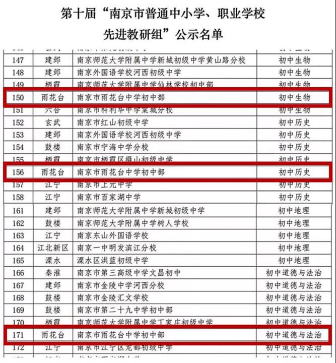 经过教研组申报、学校推荐、区级初审、评委会终评等程序,近日,第十届“南京市普通中小学、职业学校先进教研组”评选结果正式揭晓,雨花台中学初中部历史教研组、德法教研组和生物教研组喜获南京市第十届先进教研组称号!这是我校继语文、数学、英语、物理、体育、生物荣获南京市先进教研组后,教育教学事业上新添的亮丽一笔。