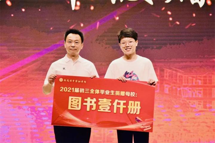 孙校长对同学们进行谆谆教诲和殷殷祝福后,为同学们颁发了毕业证书。同学们接过了毕业证书,也接过了嘱托和期盼。初三年级部全体毕业生向学校赠送了一千册图书作为毕业礼物,他们用实际行动表达了对母校最真挚的爱与祝福。