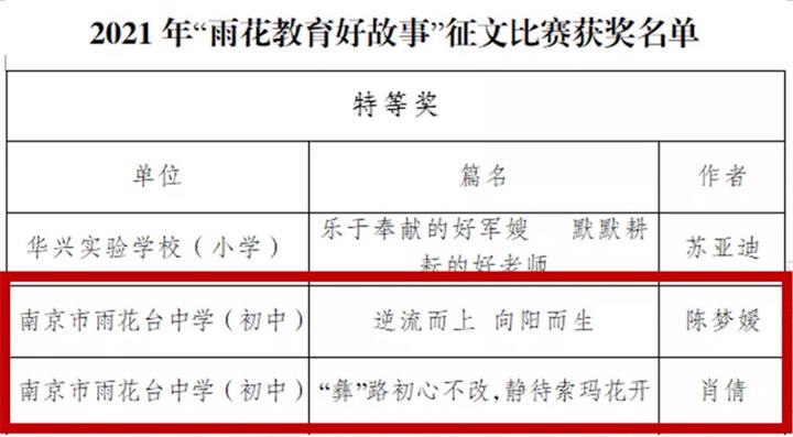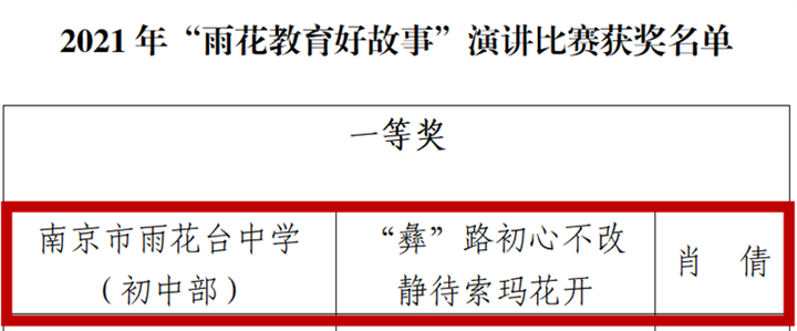 在2021年“雨花教育好故事”征文评比和演讲比赛中,雨花台中学初中部精心组织,学校教师踊跃参与,经区内评选、比赛,我校陈梦媛老师征文作品《逆流而上 向阳而生》、肖倩老师征文作品《“彝”路初心不改,静待索玛花开》,均荣获2021年“雨花教育好故事”征文比赛特等奖!肖倩老师在本次演讲比赛中荣获一等奖!
