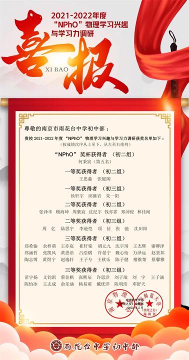 近日,2021-2022年度“NPhO”物理学习兴趣与学习力调研结果揭晓,雨花台中学初中部58名同学在比赛中表现突出,喜获佳绩。其中,初二17班何秉宸同学凭借扎实的物理学科素养,冲入十强(特等奖),取得第五名的好成绩,荣获初二组“NPhO”奖杯 ;初二6班王思淼、初二18班张庭阁、初三11班侯轩宇、初三12班邱继岩、初三11班朱一阳同学荣获一等奖 。