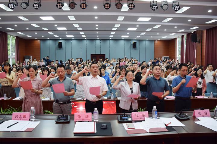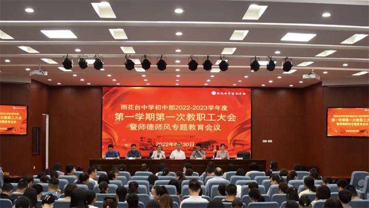 8月30日上午,雨花台中学初中部2022-2023学年度第一学期第一次教职工大会暨师德师风专题教育会议在我校弘雅厅召开,本次会议对暑期工作进行了总结回顾,并全面部署了新学期各项工作。雨花台中学初中部党总支书记、校长孙进,副校长冯志强,党总支副书记、副校长沈丽,副校长张睿,副校长栾娟,工会主席曹晓旻同志出席会议,会议由沈丽副书记主持,全体教职工参加了本次会议。