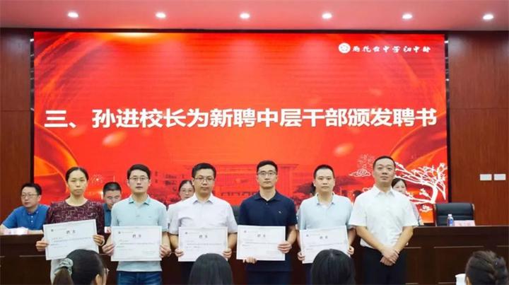 接着,孙进校长、沈丽副书记、冯志强副校长、栾娟副校长、张睿副校长依次介绍了新学期校级领导分工及各项聘任决定。孙进校长为新聘任的雨初中综合行政处王继虎副主任(主持工作)、课程教学处郭新俊副主任、教师发展处王群丽副主任以及学生工作处高阳副主任颁发聘书。新的岗位,意味着新的责任与担当,他们将会在各自的岗位上勇挑重担、主动作为,为雨初中的教育事业发展贡献力量。