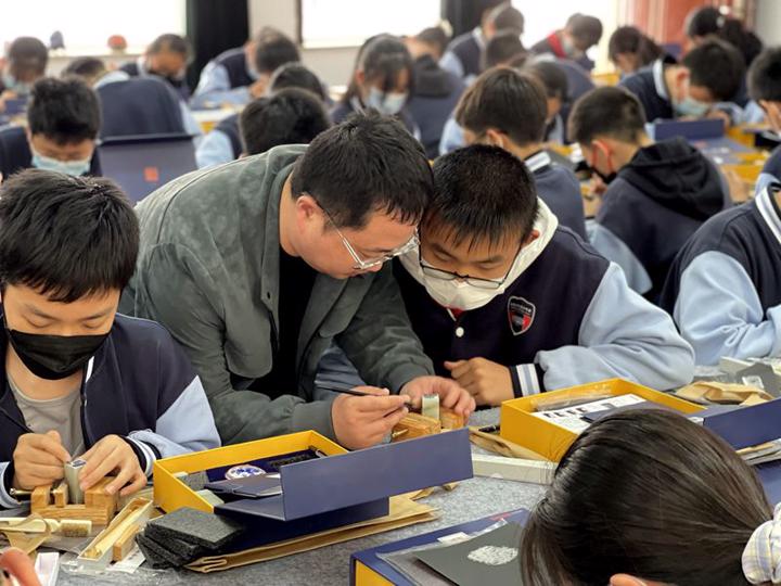 美术组张轩瑜老师代表美术组青年教师参赛,张老师开设的《西汉官印鉴赏与临摹》一课,根植于雨初“和雅”课堂文化,将传统篆刻文化带进课堂,通过“对比”、“赏析”、“实践”、“评价”等教学活动,使学生对西汉官印的“字法”、“章法”、“篆法”有更明确的认识,整体环节循序渐进,深入浅出,营造了和谐、互动、探究的良好学习氛围,让学生在一凿一刻的方寸世界里体验和传承中国传统优秀的篆刻艺术,亲历过程与实践,内化于心,从而进一步感受优秀中国传统文化的博大魅力,提升审美素养。