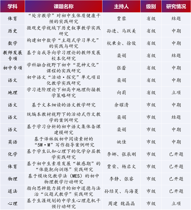目前,我校有“十三五”课题10项,其中省级课题4项,市级课题6项,“十四五”课题6项,其中省级课题2项,市级课题4项,市区级个人课题30余项,几乎涵盖各门学科,在南京市所有中小学中名列前茅,带动了教师教育科研能力的不断提升。我校有九个教研组先后被评为“南京市先进教研组”。近三年,教师赛课及课件获奖134人次,发表论文、出版著作170人次,获奖论文71人次,开设公开课156人次、讲座145人次。