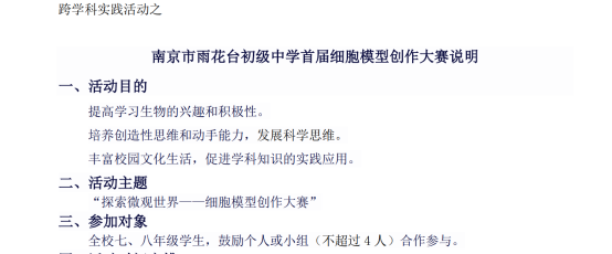 为了提高同学们学习生物的兴趣和积极性,培养孩子们的创造性思维和动手能力、发展科学思维,并且丰富校园文化生活,促进学科知识的实践应用。初一、初二生物备课组将于国庆假期期间开展首届细胞模型创作大赛。