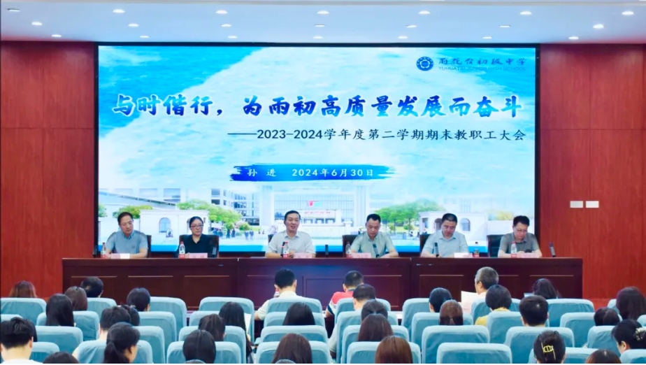 春日渐远,夏日初长。充实、忙碌、收获满满的一个学期在一个个笃行不怠的背影、一幕幕奋斗不止的画面中拉下帷幕。为全面总结回顾本学期重点工作,厚积下一阶段学校高质量发展的蓬勃力量,2024年6月30日上午,雨花台初级中学2023-2024学年度第二学期期末教职工大会顺利举行,雨花台初级中学孙进校长、冯志强副校长、沈丽副书记、张睿副校长、冯作涛副校长、工会曹晓旻主席出席本次会议,全体教职工参加了会议,会议由冯志强副校长主持。